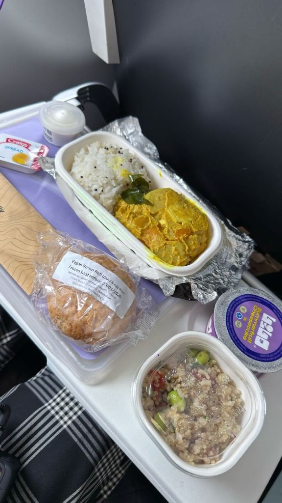 The food options also left much to be desired, particularly as I was unable to consume the provided curry; while the remainder of the meal was acceptable, it did not rise to the level of being called amazing or commendable. Additionally, the service was rather slow, leading to a two-hour wait before the trays were collected, whereas I received mine less than 30 minutes after takeoff. Even in fine dining contexts, such delays would be considered excessive.