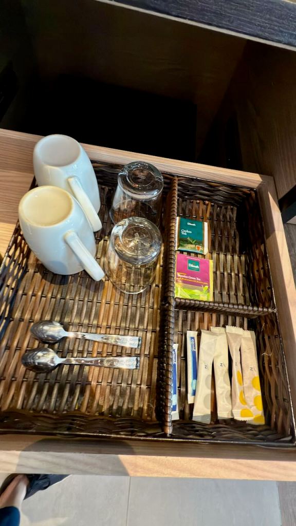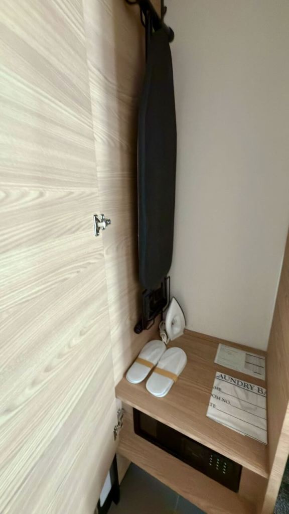 Upon entering the room, on the left is a closet space with a small enclosed area where the ironing, safe and slippers are placed. There’s a luggage rack right under the hanger space and they do provide 2 robes. On the right of the hanger space is the minibar, while it is well stocked it is all chargeable as well. They have a bar style mini fridge which is also fully stocked with all kinds of drinks. I’m surprised that their complimentary mini bar doesn’t include instant coffee since that’s fairly common including tea, but they only have 2 tea bags there. Next to the closet/mini bar area is the full length mirror and then a connecting door to the room next door.