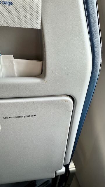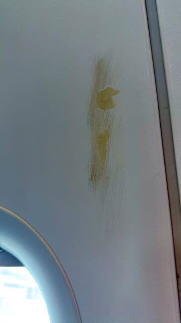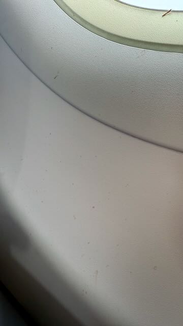 The state of this particular aircraft could do some work as well, the seat back and wall were splattered with stains which means they didn’t do any cleaning (or attentive cleaning if they did) between turnover or even overnight. The lighting strip cover was also looking a bit gross with some weird stains on them, I’m not quite sure how they got there or what exactly it is, since I don’t presume coffee can be poured on it.