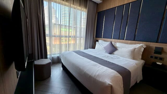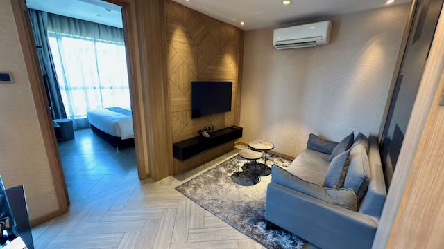 On the right side of the room there’s a 4 seater dining table and a balcony, although the balcony floor was a bit gross so I didn’t feel like going outside, also it’s fairly hot. Opposite the dining area is the living area, with a 2 seater sofa and a TV. Further in is the bedroom, with a King bed, a TV, a stool, a full length mirror with makeup lighting, a large closet space with a bathrobe, slippers, umbrella and a safe provided.